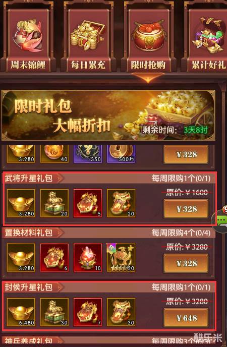 2、特惠礼包限时抢购里边有两个礼包也能获取部分封侯印,分别是武将升星礼包和封侯升星礼包。