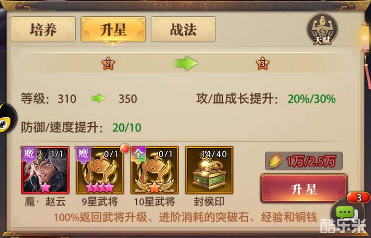 当主公等级达到148级或世界等级138级时,升星一个十三星武将需要40个封侯印与一个六星本体,还有九星同阵营武将与十星任意阵容武将。