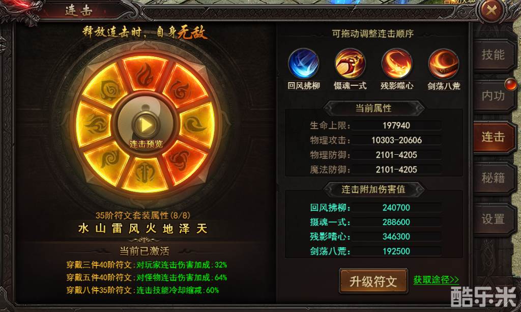 2、点击技能、选择合击,合击需要镶嵌对应的符文增加合击伤害