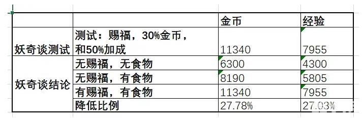 目前妖奇谈的赐福是50%经验和50%的金币加成,食物加成是金币30%,经验35%。