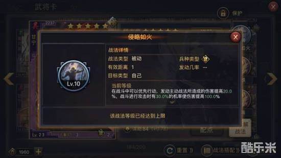 在战斗中可以优先行动,由于是被动战法,所以先手效果要先手于主动战法和指挥战法。发动主动战法所造成伤害提高20%(伤害提升不解释)战斗进行攻击时有30%几率使伤害提高100%。这里的几率判定是单独判定,如你普通攻击算一次,战法攻击算一次。甚至如果有反击效果,反击效果伤害提升也算一次判定。