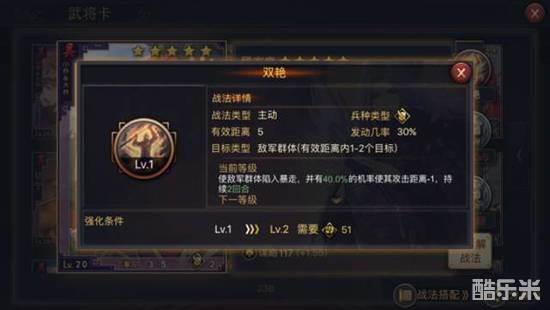 满级后有80%的几率使敌军群体攻击距离-1。当然本身战法释放几率有点低,同时不能确保释放给敌军两个人,所以使得她改版后提升效果不怎么明显。如果要使用她,这里推荐有一个先手效果,弥补她速度上的缺陷。然而,她的攻城值却是这个武将的一大亮点。