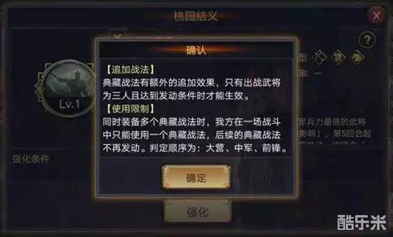 每个典藏战法追加效果生效的条件不一样,如凤仪亭它的追加效果要想生效,则需要我军三个武将兵种相同。