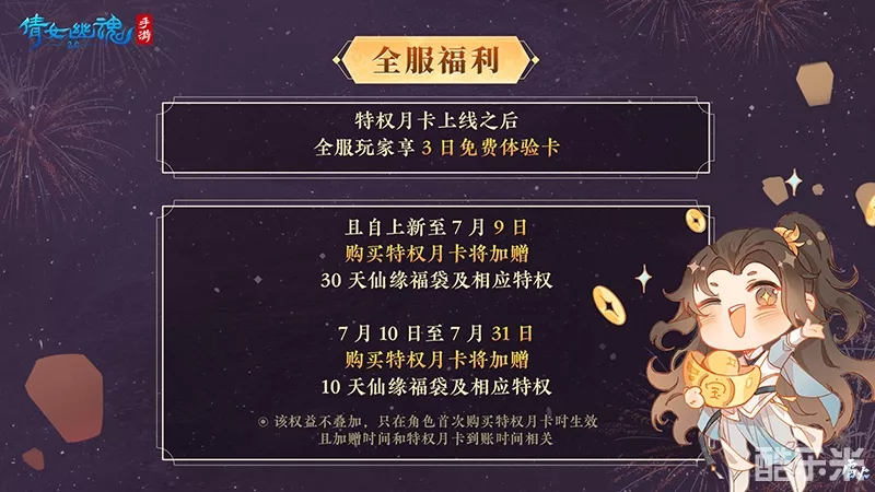 与此同时更有全服福利,免费体验机会等你体验!特权月卡上线之后,全服玩家可享3日免费体验卡!且自6月19日上新至7月9日,购买特权月卡将加赠30天仙缘福袋及相应特权;7月10日至7月31日,玩家购买特权月卡更将加赠10天仙缘福袋及相应特权!