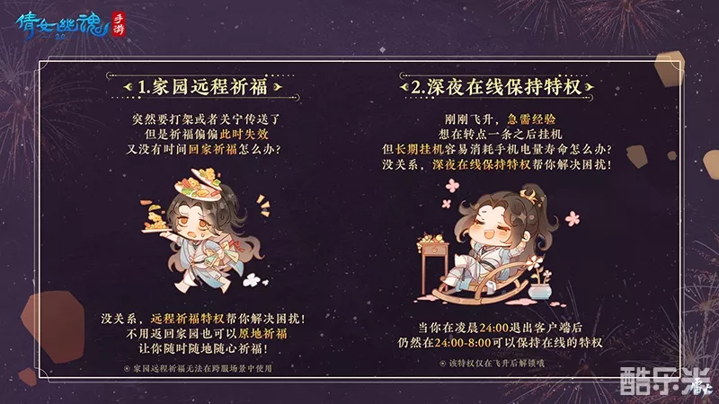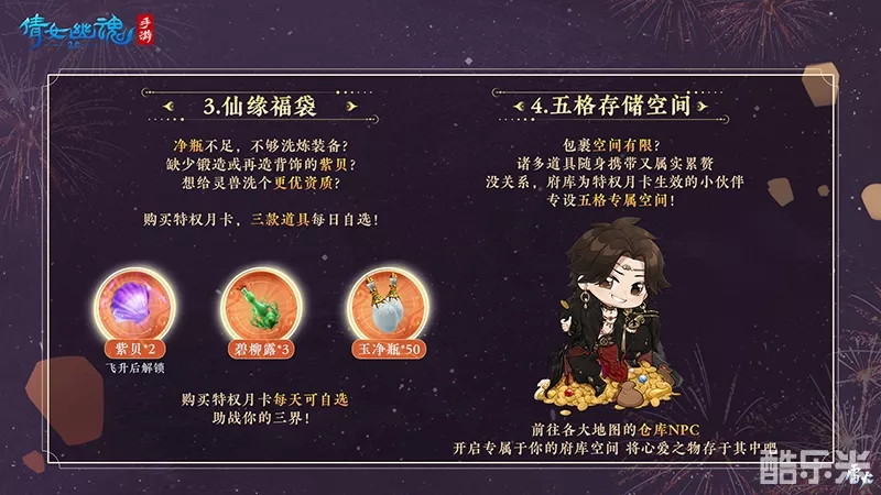 特权月卡生效期间,玩家更可畅享多种特权!家园远程祈福,可随时随地随心祈福!深夜在线保持特权,玩家凌晨24:00退出客户端后,在24:00-8:00可保持在线特权(此特权仅在飞升后解锁)!紫贝、碧柳露、玉净瓶三款道具每日自选!专设五格存储空间,快前往各大地图的仓库NPC开启专属于你的库府空间!