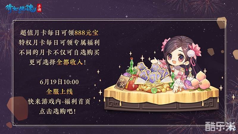 全新【特权月卡】即将上线!玩家购入立得680倩女点、还可每天自选指定任一道具,售价68元,超7倍返利!6月15日将在莫愁烟雨、决明子、灯花影、若有云兮、帝都风云,五个服务器测试投放,6月19日10:00特权月卡全服投放!小伙伴们千万不要错过~