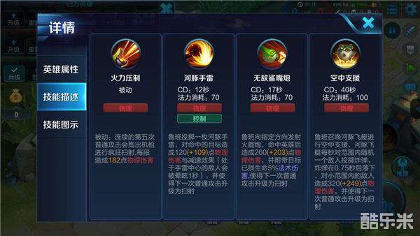 一技能-河豚手雷:鲁班七号投掷一枚手雷,对命中目标造成物理伤害与减速效果,处于手雷中心的敌人会造成晕眩效果,并使下一次普攻升级为扫射。