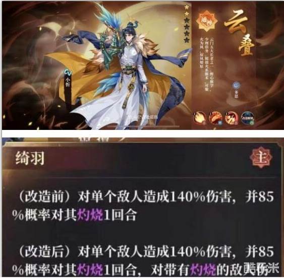 灼烧流输出,特有的依靠灼烧打输出的卡,特点是普攻高概率灼烧并且可以有较高概率延长灼烧DB,改造可能3回合内增加效果命中,更容易附加灼烧。