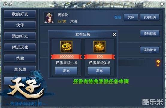 还在纠结自己的升级速度不够快?现在《天子》手游全新师徒系统,让每一个玩家都能轻松快速升级!只要你是65级以上玩家,没有拜师在其他人门下,点击“人物”内“社交”按钮,即可登录到“师徒”界面,随机或指定某玩家缔结师徒关系。搭配全新的“教学任务”系统,无论你是师徒中的哪一方,你都能够因为这一系统而获益良多!