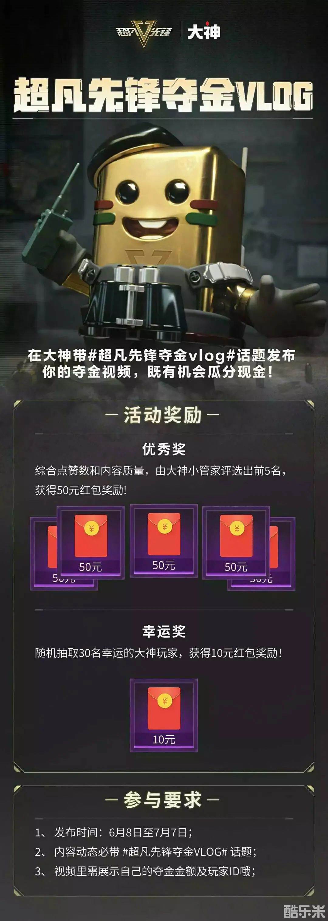 6月8日-7月7日,上大神APP带#超凡先锋夺金VLOG#话题,发布你的夺金视频,即有机会瓜分现金大奖!大神小管家会根据点赞数和内容质量,选出前5名,送出50元红包奖励,除此之外,更有30名幸运玩家有机会赢取10元现金好礼!快上大神发视频,下一个幸运锦鲤就是你!