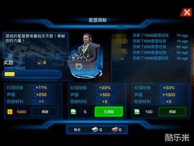 每天每个星盟成员可以向星盟进行捐献,捐献分为三个等级,第一等级捐献1000星币、第二等级捐献5点信用点、第三等级捐献100点信用点。根据你捐献的等级不同,你可以获得的buff加成也不同,Buff加成分为扫荡经验加成、声望加成、防御材料加成。捐献等级越高,加成越高!
