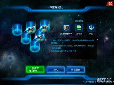 玩家可以加入深空探险队或者号召盟友、雇佣舰队与你一起进行一次深空冒险,探险队一共由6名成员组成,分为发起者一名和五名协助者,集齐6人后,探险队即可出发,完成后玩家可以获得相应的声望奖励,每天一名玩家只可以获得一次奖励,但是可以参加其他人的探险队,帮助其他人获得奖励。