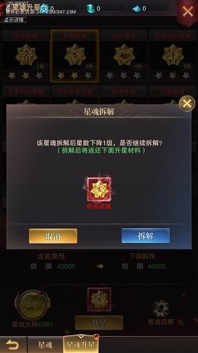 星魂升到3星需要进阶,进阶后才能继续升星。升星过的星魂可以进行拆解,拆解每次只能拆1种星魂,降低1个星级,返还升星所用的材料。