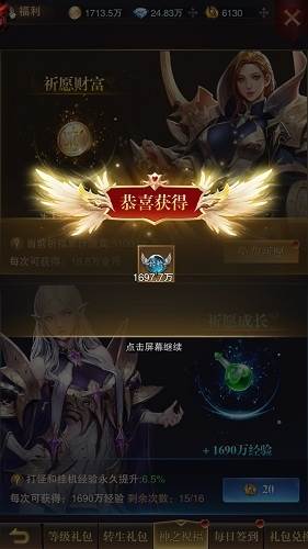 玩家每天可消耗钻石进行16次祈愿经验(当天祈愿次数越多,单次消耗的钻石数量越多)。玩家每祈愿1次,打怪和挂机获得经验值会永久提高0.1%,最高可永久提升至100%。