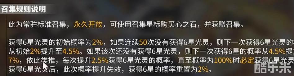 常驻卡池六星初始概率为2%,如果连续50次没有抽到六星角色的话,那么下一次六星角色的概率会从2%提升到4.5%,增加2.5%。后每抽一次,如果没有抽到,都可以增加2.5%,直到概率100%时,必定抽到六星。直到抽到六星角色后即可失效,回归概率2%。