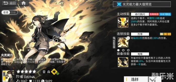 职业爆破,满级3067攻击,防御1133,生命9699,4个光灵中属于他属性最低,但烈雀的机制齐全,主动技能输出+转色,在觉醒后可以解锁电啄,提高雷属性格子敌人的伤害,并且给队伍提供一半加成,如果你队伍内拥有雷系主C或6星雷变化光灵的话,可以选择烈雀进行输出;