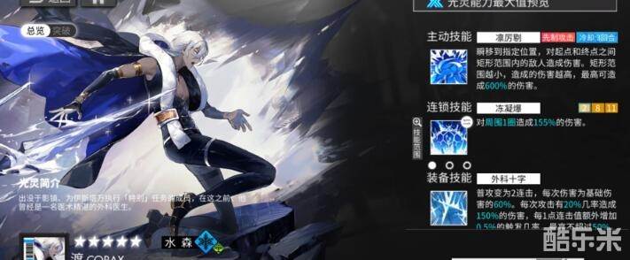 水系爆破,主动技能拥有全屏位移的机制,目前在所有的水系光灵内,拥有位移技能的光灵并不多,渡可以用来当做队伍的位移挂件,配合狙手莉丝打游击,属于功能性比较优秀的光灵;