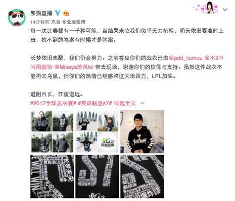 而在昨日WE和SSG的对阵中,熊猫直播的三位人气主播PDD、若风、周淑怡也身穿印着上百个LPL粉丝们的名字及寄语的“熊猫S7战衣”前往现场,为WE打气。这一举动,也让粉丝们感到戳心,并纷纷称赞主播们及平台具有情怀。虽然,LPL战队最终未能顺利踏入鸟巢,但是纵观今年的表现,我们有足够的理由相信,LPL明年一定会更好!感谢所有现场观众、直播间粉丝的信仰及支持,熊猫直播必将携手签约战队,明年卷土重来!神州,必定会再次雄起!