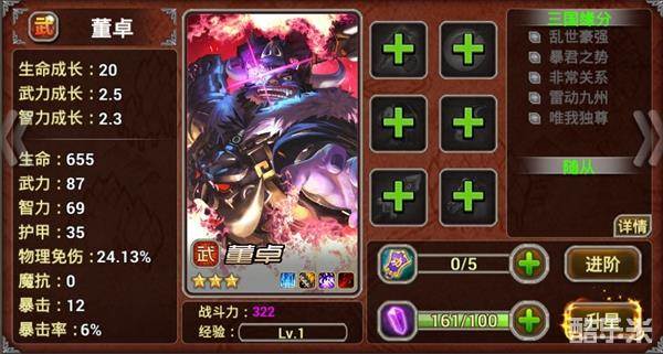 董卓:近战防卫型,拥有很高的生命值,并能控制满前的敌人。独白:“放开那个妹子,让我来!”(作者旁白:不要以为体积大就了不起,好吧,你的刀很锋利,我什么都没说。)