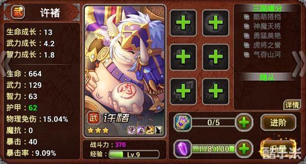 许褚:近战杀伤型,拥有恐怖的伤害和顽强的意志,战斗中死亡会令自己重生。独白“我好想听到了女神的呼唤,燃烧吧我的小宇宙。”(作者旁白:你的圣衣呢,拿出来晒晒。)