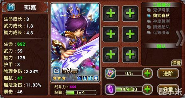 郭嘉:远程杀伤型,能突袭敌人后排,并减弱敌人的抵抗能力。独白:“我的生涯一片无悔,我想起那天夕阳下的奔跑,那是我失去的青春!”(作者旁白:你是最有自知之明的,可惜你的青春实在短暂。)