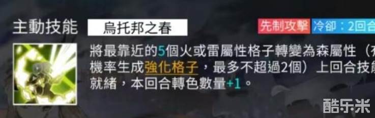那席里斯的转色主动技能冷却时间短,且技能为先制攻击,可以将地图中的火与雷属性格子转变为森属性。当那席里斯达到满突破时,最多同时转色六个格子,且有一定的概率产生至多两个的强化格子。那席里斯的强度,主要体现在她不需要突破就已经拥有的先制攻击,基本上奠定了她在森队中不可取代的地位以及超高的出场率。