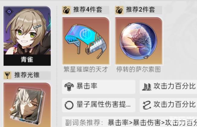 4.量子套青雀,必须暴击衣!不暴击的青雀,就别玩了,前面铺垫也没用了,辅助给你增益都拉满了,你一套下来不暴击,完犊子重开吧。位面球首先停转,增加暴击率,50以上后还增加终结技和追加伤害,完美适配四命拂晓青雀,量子球攻击绳。