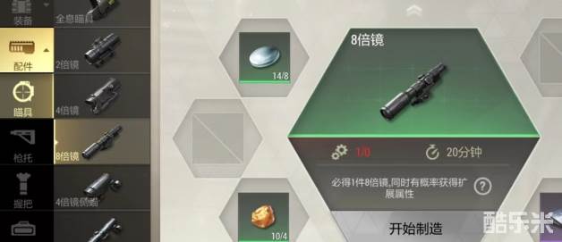 选中自己想要打造的道具之后,接下来就是收集各种材料,小编以8倍镜为例,所需要的有钢化镜片,天然树脂和钛合金。只要集齐这些就可以加入到制造队列中,时间结束之后就会直接获得获得。之后将会有几率得到扩展属性,包括精准射击,关节破坏,生命监测等,随机出现。而这些需要的材料并不难收集,任何一场战斗都能轻松找到,只要能顺利撤退,来到仓库中就能直接用于制造。