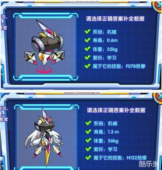 1.活动中有智能宝宝和机械萝莉随机出现,需要小洛克们进行数据补齐,每个宠物有五项数据,分别会进行问答,其实就是宠物的基本信息:属性、身高、体重、爱好、技能。答对一项+5点进度,下面直接来看正确答案: