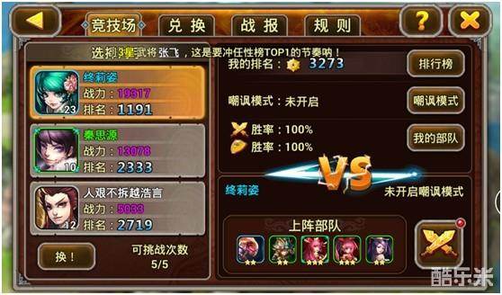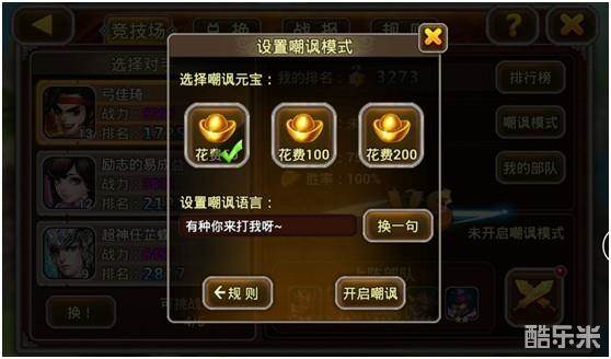 在选择对手的时候,可以通过“换”来刷新,直到找到你觉得有把握的,一定要耐心选,不要让费机会哦。当然如果你的实力够牛,可以开启嘲讽模式,开启嘲讽模式需要花费元宝,花费的元宝越多,防守胜利后获得的竞技币也越多,开启后防守3次无论输赢嘲讽模式会自动关闭。