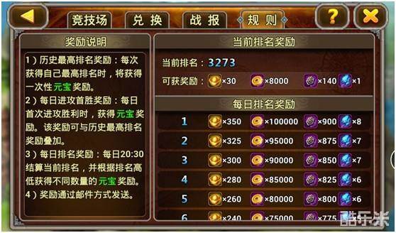 竞技场会在每天晚上20:30分进行结算,根据排名情况发放奖励,包括元宝、金币、竞技币和重铸石。