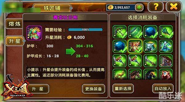 除了熔炼掉一些不用的装备,你还可以选择把他们用来升星!挑选你想要升星的装备,把多余装备用来提升星级,不仅可以提升装备的成长值,提高装备的主属性,还可以返还部分消耗装备强化的费用。打造专属自己武将的神兵利器就在此一举了!从此无论是单挑还是群战,无论是北伐还出征,三国沙场都会有你的一席之地!