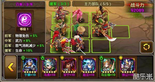 推荐理由:主T加援军T,双奶2保1,DPS关羽周瑜。关羽的单体输出和群体输出伤害可观,周瑜大招伤害可观,离间技能扰乱敌方战斗节奏。阵法前军增加物免,中军武力加成,后军减怒气消耗更快释放出大招。