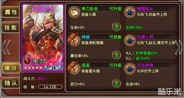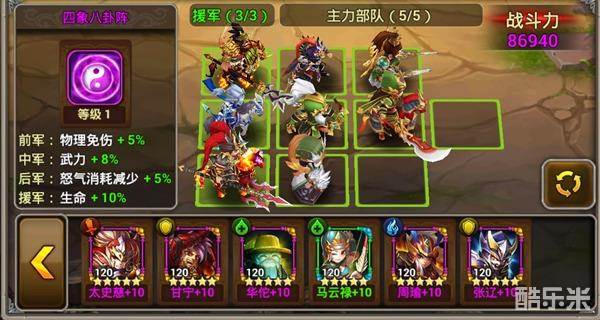 这个阵容的特点是可以触发大量的武将缘分,每个武将都有缘分被触发,主力还会触发更多缘分,而且上单挑的只有单挑最强之一的关羽,其他人都不会被选上单挑,不管是攻击还是防守,都是无懈可击的。