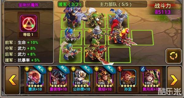 推荐理由:高物理伤害阵容,单体群体伤害可观,后军马岱有击退技能,搭配武将缘分加成,阵法舍弃前军位置,放置中军和后军