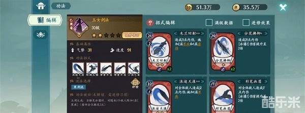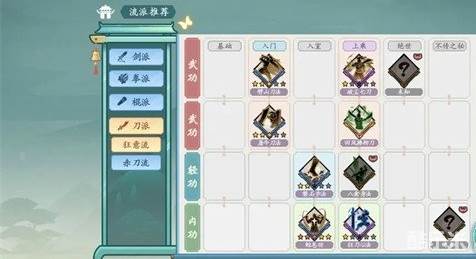 功法分为绿蓝紫金四种颜色,抽卡和收集碎片合成可以获得功法。目前有剑拳棍刀四种战斗方式,两本武功一本轻功一本内功为一个流派,每种功法内有若干招式,可自行挑选搭配流派和招式。
