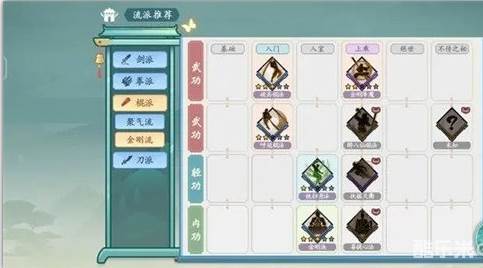 图四,流派名称及需求的武学有哪些,正常一套是两武学,一轻功,一内功,总共带四本武学,图四里面空着的➕号点进去可以看替代的武学有哪些。品阶高的武学很难频繁抽到拿来升级,所以一些品质低,高等级才是中流砥柱!主要还是看搭配的嘛