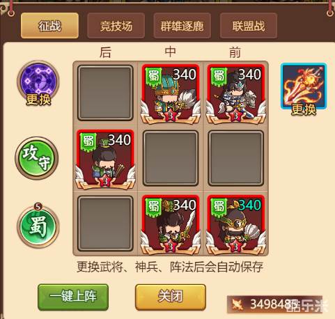 进攻方面:利用诸葛亮群体伤害技能消耗敌方血量,在配合刘备优先攻击血量最少敌人和击败敌人再次行动特性,可在单回合内完美结束战斗!