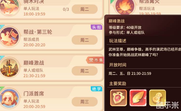 巅峰激战会在每个服务器开启后的第二天开启,并以两天为一个周期循环开放。开启时间为开启日当天晚上21:30-21:59之间。活动采用的3V3对阵的擂台赛打法,等级达到40级的小伙伴均可以单人或者组队状态进行报名,当然小队最高上限为3人,当队伍人数不足时,也会由系统进行匹配散排玩家进队,弥补缺少的人数。
