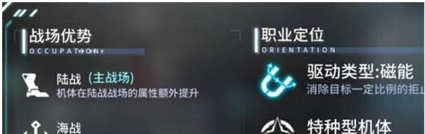 在研究技能效果之前,首先要先搞清楚战场优势和职业定位,所在这两项是确定使用环境的重要依据,优势战场在陆地上,陆战过程中有着额外属性提升,直接定位为特种型机体,能够提供各种增益状态和对敌方进行消弱,以及利用自身磁能驱动类型消除目标身上的拒绝立场,拒绝立场就相当于是护盾,所以在队伍整体方面有着较好发挥,比较依赖阵容搭配发挥出作用。