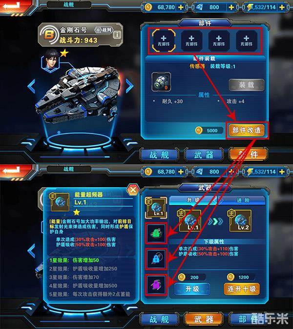 单纯提高等级并不能达到战胜强大敌人的要求,这时候就需要集齐部件,对战舰进行部件改造,解锁更具威力的武器。