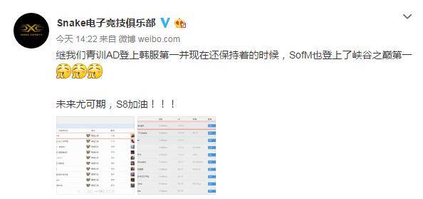 今天下午Snake官方微博更新,称青训AD保持韩服第一,且SofM登顶峡谷之巅!这对于下一赛季的蛇队的比赛是一个很好的开端!
