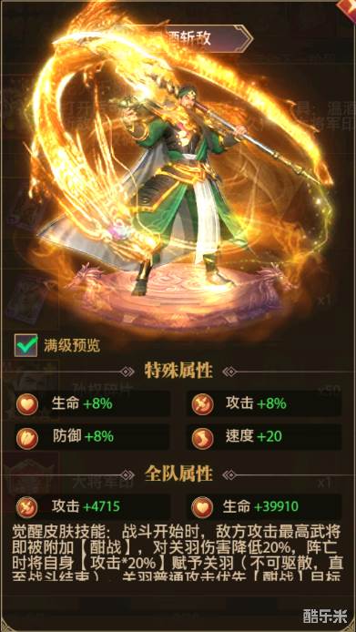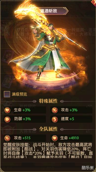 这个活动的每一样奖励都是对提升自身阵容基础属性和战力有所帮助的,因此只要去抽,都不会有亏了的说法,特别是活动的大奖之一的花火千树自选礼包,可以选取到猛将关羽的皮肤——温酒斩敌。关羽本来就是比较强势的武将,当获取到皮肤并觉醒后,更是获得新的技能【酣战】。