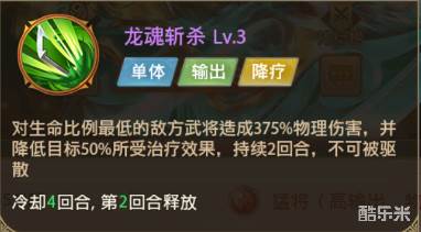 【酣战】在战斗开始时会对敌方输出最高武将附加酣战效果,对关羽造成的伤害会降低20%,死亡时会将自身攻击力的20%赋予关羽,不可驱散。简单来说就是你打我的伤害会降低,但我干掉你或者队友干掉你还会偷取你的攻击力,并且关羽的普通攻击还会优先攻击带酣战的目标。