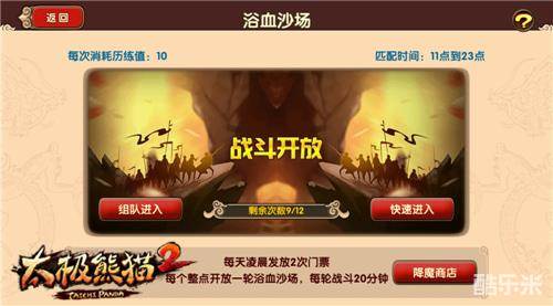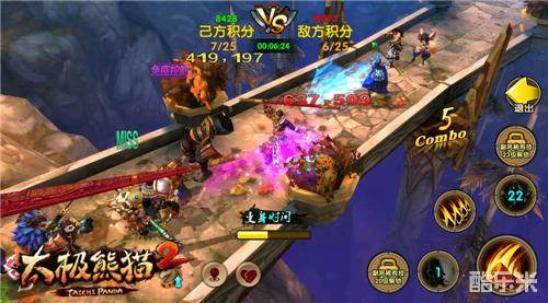 《太极熊猫2》一直都非常注重玩家的交互性内容,在实时竞技方面也有不俗的表现。新资料片中增加的浴血战场将采用25VS25的对战模式,玩家可以进行跨服对抗。战场采用积分制,玩家击杀怪物、BOSS、敌对玩家、敌对据点守护神均可获得积分。地图右上角和左下角分别为红方和蓝方的据点,对应阵营的玩家进入场景或者复活,都会出现在己方的据点,据点内有守护神以及两座防御塔,敌对玩家靠近会受到每秒百分比伤害。
