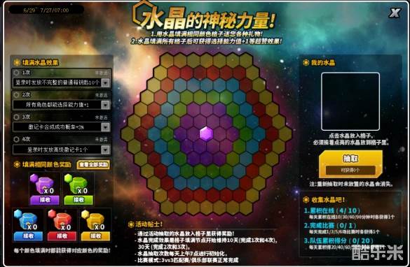 活动规则:通过活动获得的水晶放入格子里获得奖励。填满水晶获得的效果是格子填满节点开始维持十天(一次和四次奖励)和三十天(二次和三次奖励)。水晶抽取次数每日上午7点初始化。场次相关任务需进行正常结算的3V3匹配赛俱乐部联赛。