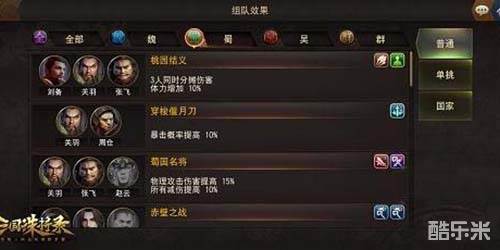 3、关羽的组队效果种类,也是全游戏的佼佼者,与曹操的“别来无恙”,与张飞、赵云的“蜀国名将”,与黄忠的“黑白胡须”,都是能提供立竿见影的伤害提升buff的组合!在前中期拥有的武将数量不是很多的情况下,关羽能极大提升队伍的灵活度和适配能力,发挥他们的上限,是个很平滑的选择。