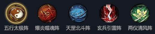 目前阵法有五个,这五个阵法的搭配分别有五行太极阵、爆炎噬魂阵、天罡北斗阵、玄兵引雷阵、两仪清风阵、每个阵法分为2个“小阶段”