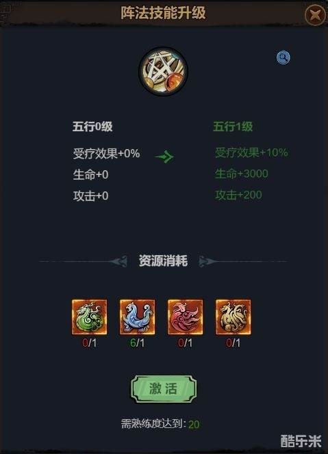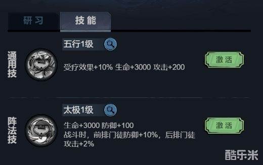 拿五行太极阵来说,第一步为激活通用技“五行”,第二步为激活阵法技“太极”,激活通用技需要熟练度20,青龙,白虎,朱雀,玄武4种四象石各一个,激活阵法技则需要熟练度50,4种四象石各一个.