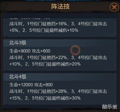 天罡北斗阵:最高属性1号位格挡加28%,2/5号位最终减伤30%,3/4号位攻击可以加15%适合阵容孔慈,步惊云,花木兰,慕容纱,楚心月等强势武侠。